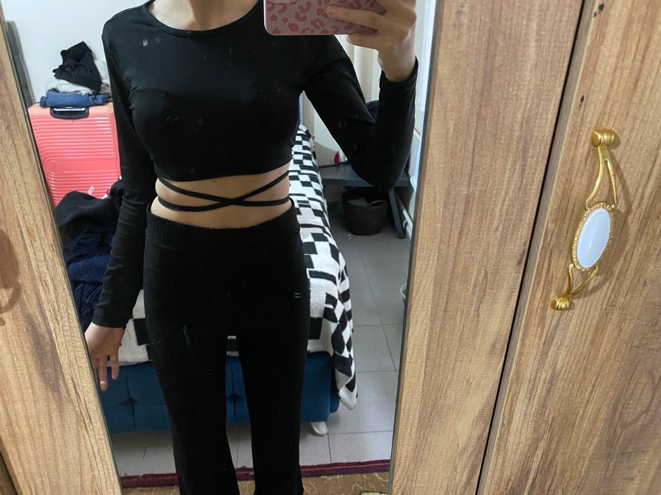 Siyah, halter yaka ve kemer detaylı, vücuda oturan crop top. Çok şık görünüyor Defosuz s-m uyumlu