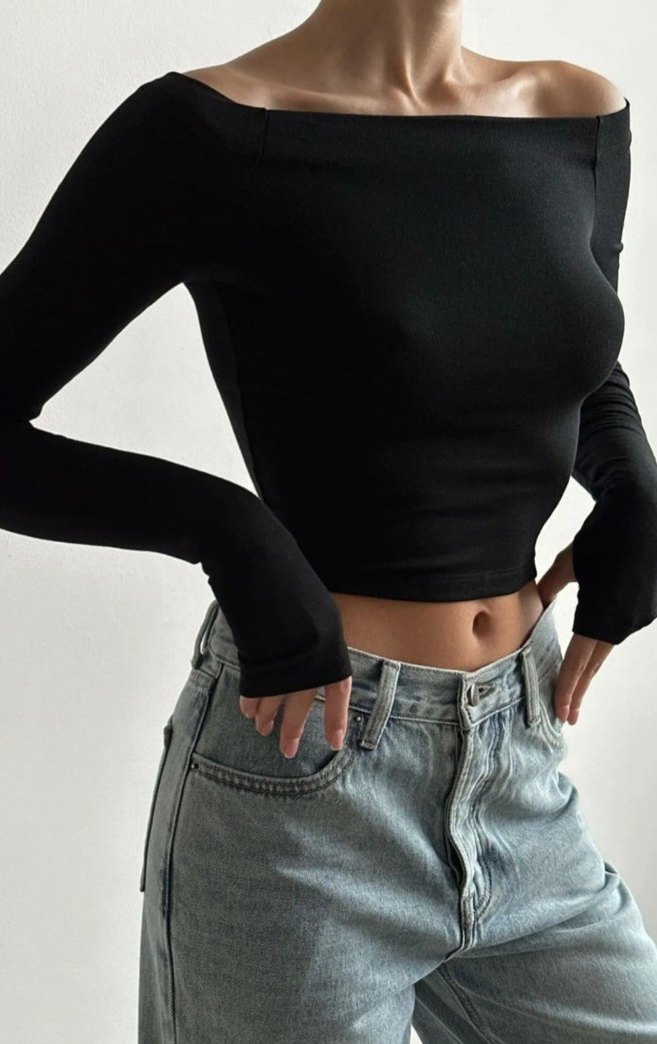 Siyah, uzun kollu ve omuzları açık crop bluz, yumuşak kumaştan yapılmış, günlük ve şık bir tarz sunar.