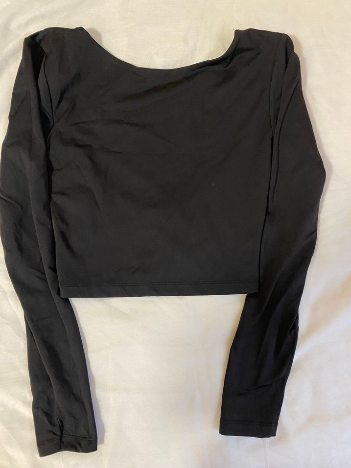Siyah, uzun kollu, kısa crop üst. Önü düz ve sade. Arkası derin oval açık ve kenarları büzgülü. Esnek kumaş, vücuda oturur.