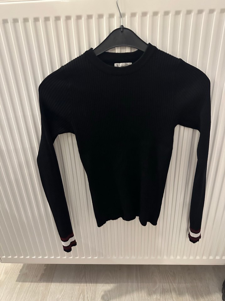 Mango marka, Siyah, uzun kollu, dar kesim ve bisiklet yaka triko kumaştan üretilmiş, günlük sokak tarzına uygun kadın kazak.