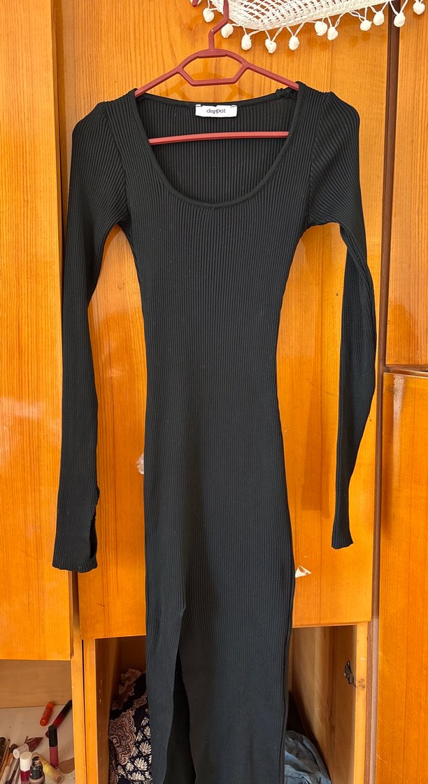 Dar kesim uzun elbise, uzun kollu ve yuvarlak yakalıdır. Siyah sentetik kumaştan yapılmış ve yırtmaç detayı bulunur. Minimalist sokak stili için uygundur.