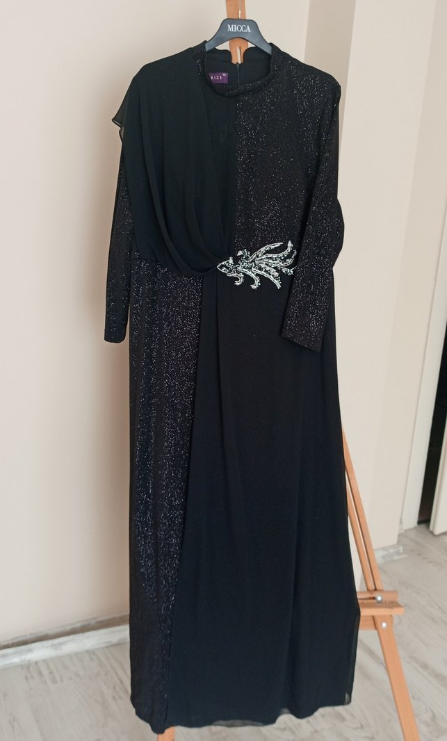 Siyah desenli, uzun kollu, yüksek yakalı ve drapeli abiye elbise. Belde süslü detay bulunur, düğün için uygundur. Bir kez giyildi. 50 beden fakat küçük kalıp