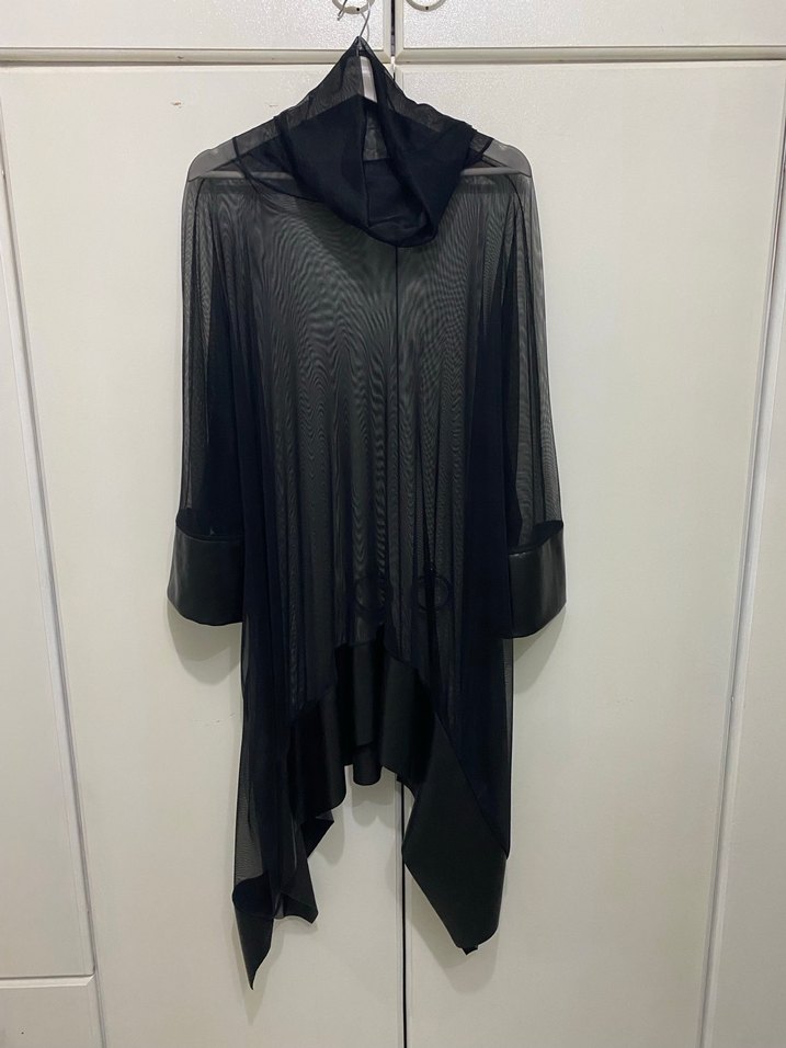 Yüksek yakalı, uzun kollu ve dökümlü tasarımlı siyah uzun tunik. Sentetik kumaştan, bol kesim ve gotik tarzı günlük kullanıma uygun. Kol ve etek uçları deri görünümlü, Standard beden, büyük bedende rahatlıkla giyebilir