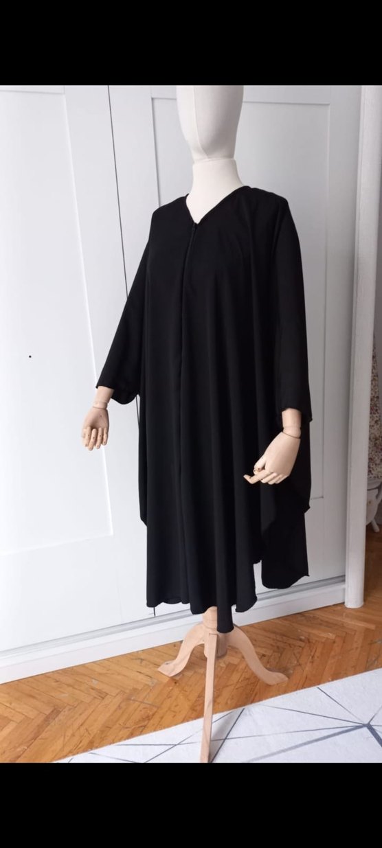 Siyah, uzun kollu, yüksek yakalı ve dökümlü yapıya sahip bol kesim hamile tunik. Ofis kullanımı için uygun, ipeksi dokuda ve gotik tarzda.