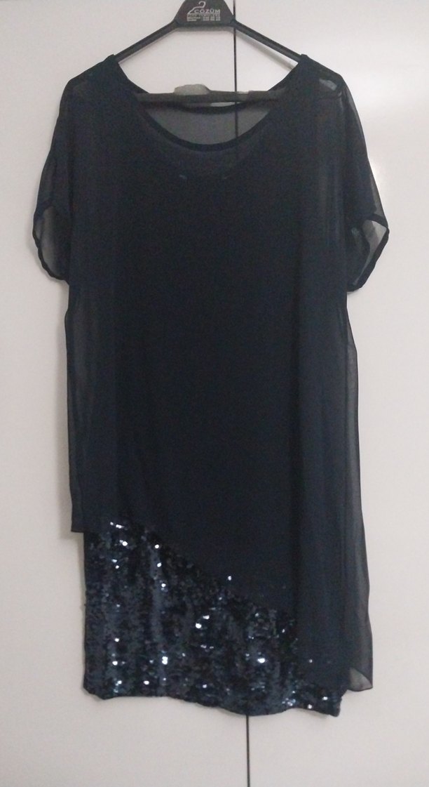 Siyah uzun, dökümlü ve kısa kollu abiye elbise, payet detaylı alt kısmıyla parti için şık bir seçimdir.