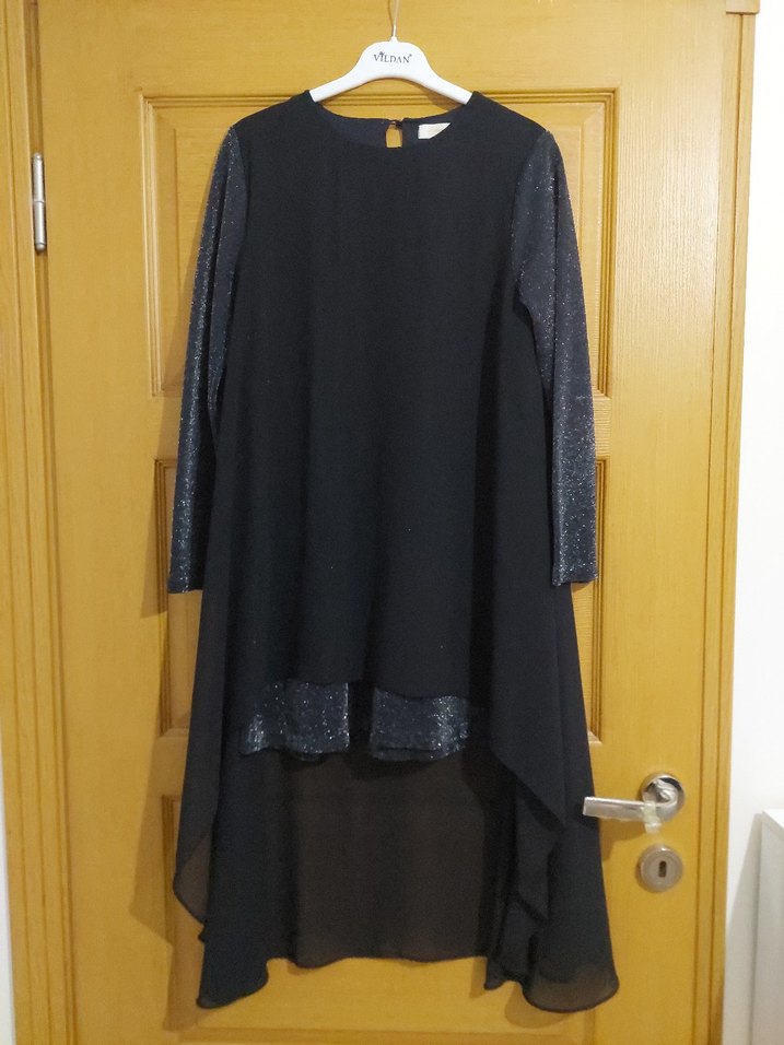 Siyah uzun kollu, dökümlü kadın tunik. Yuvarlak yaka, bol kesim ve sentetik kumaştan, mütevazı gotik ofis tarzı için uygundur.