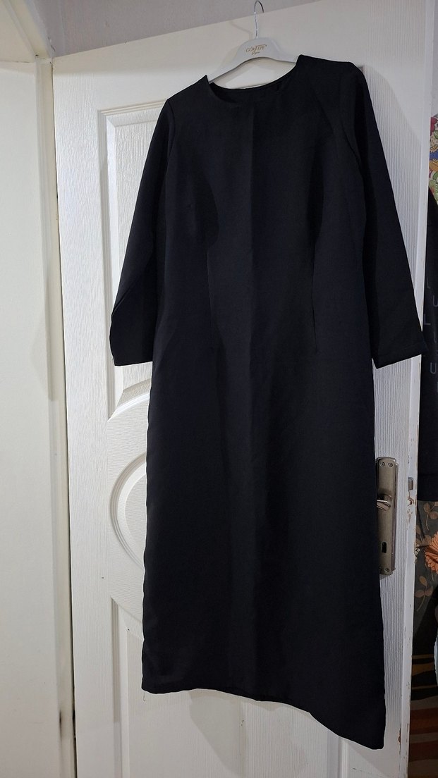 Siyah uzun kollu, yuvarlak yakalı ve dökümlü tasarıma sahip elbise. Sentetik kumaştan, sade ve mütevazı gotik tarzda, ofis için uygun.