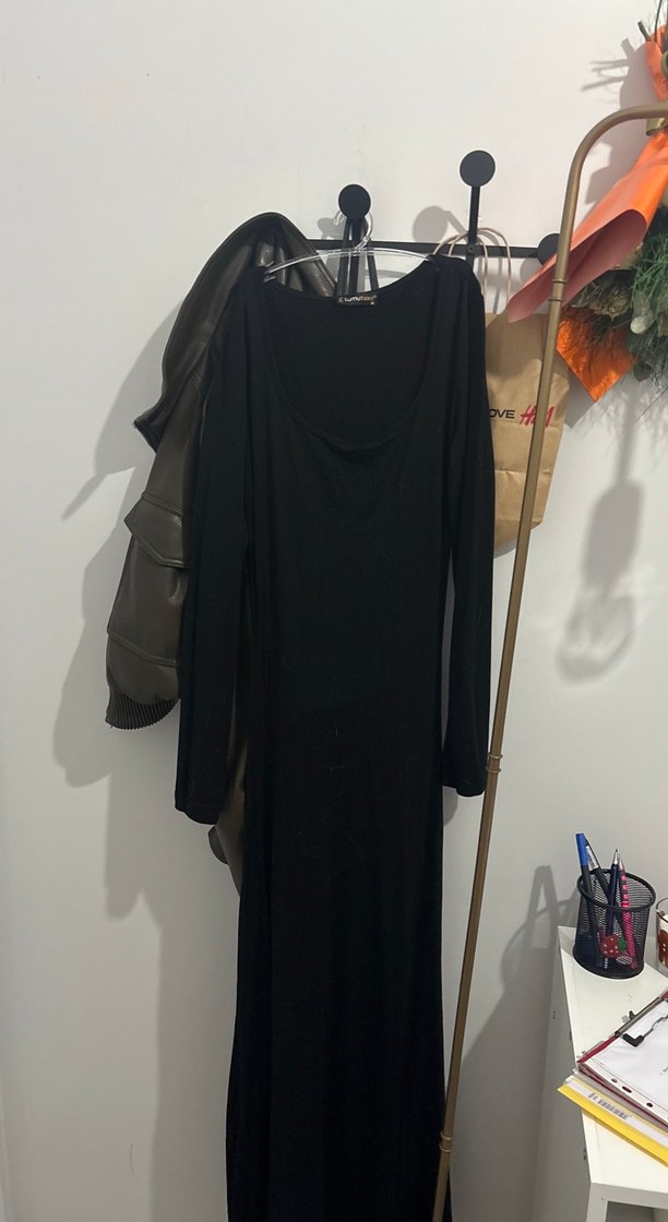 Siyah uzun kollu, dökümlü ve bol kesim keten elbise. Minimalist, goth tarzıyla günlük kullanıma uygundur.