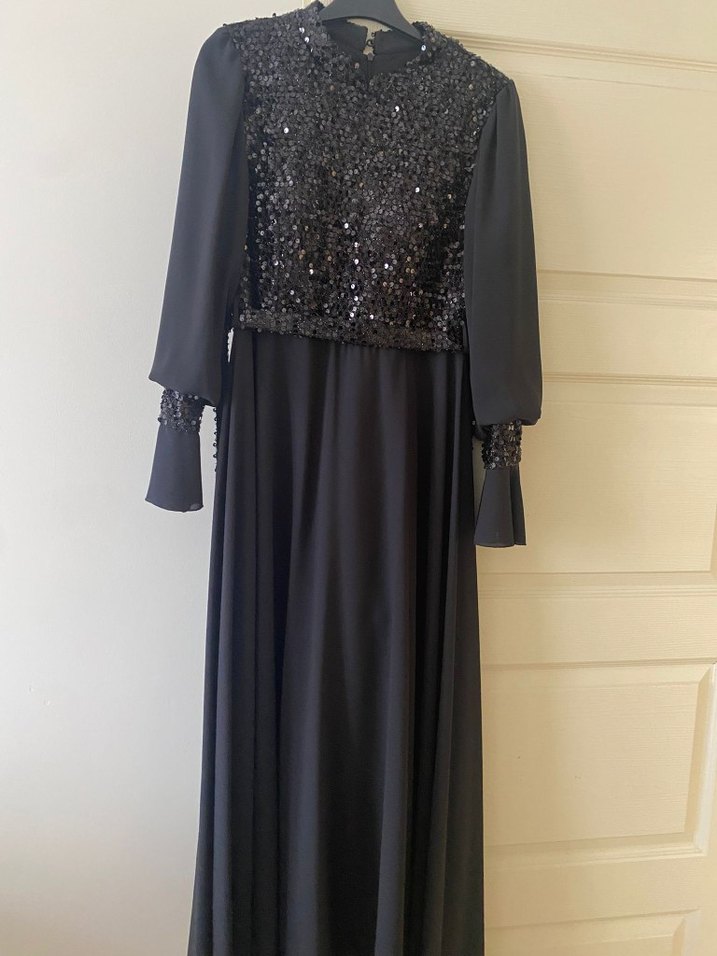 Siyah uzun kollu, yüksek yakalı, dökümlü ve bol kesim abiye elbisedir. Üst kısmı payet işlemeli, gotik şıklık sunar, düğünler için uygundur.