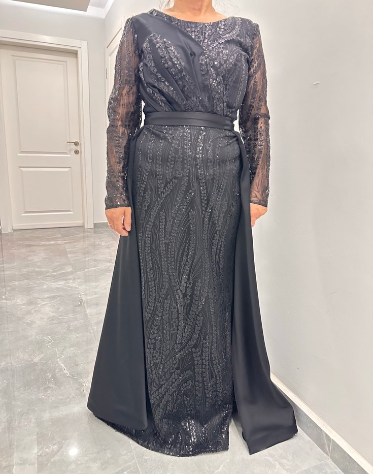 Siyah Uzun Kollu Drapeli Abiye Elbise