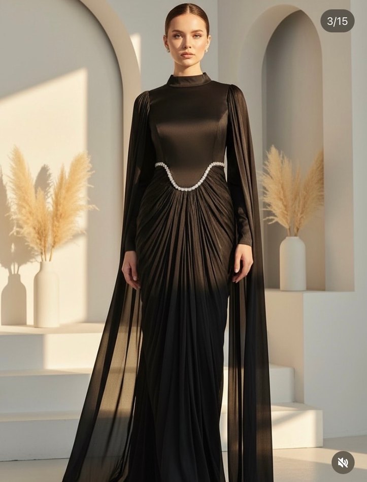 Yüksek yakalı, uzun kollu siyah abiye elbise. Drapeli detayları ve düzenli kesimi ile klasik şıklığı avant-garde tarzıyla buluşturur. 3/15. Bir kere giyildi, şal dahildir Arka taraf boyun kısmında bir taş ve bel kısmında bir taşı yok
