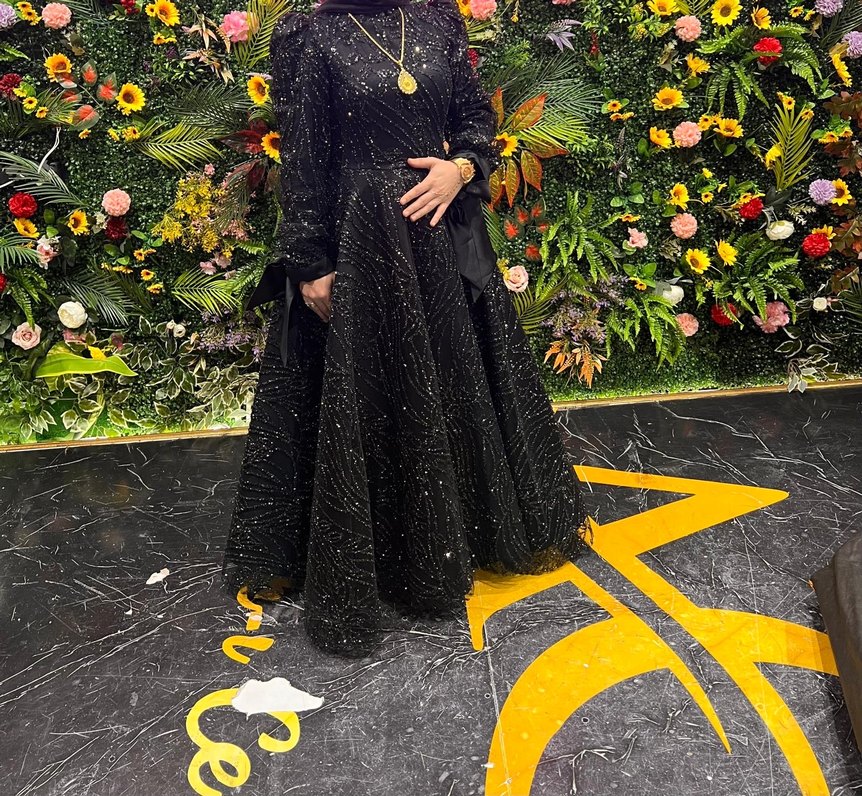 Siyah uzun kollu, drapeli ve desenli desenli abiye elbise. Bol kesim ve kayık yaka detayıyla, mütevazı düğünler için uygundur. ✨