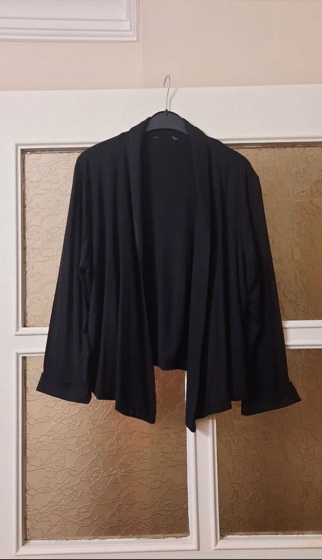Siyah renkte, uzun kollu ve bol kesim ceketi. Drapeli tasarımı ve yakası notched lapel olup, ofis kullanımı için uygundur. İki koltuk altı arası 54 cm. Arka boy 52 cm. ön boy 56 cm. uç noktaya boyu 60 cm.