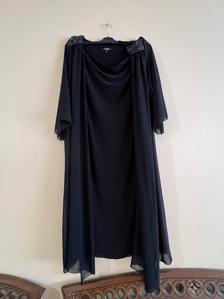 Siyah, uzun kollu, tek parça gece elbisesidir. Drapeli, bol kesim ve tek renk tasarımıyla gotik şıklık sunar. Uzun boyu düğün için uygundur. ✨ sadece bir kez giyilmiştir hiçbir sorunu yoktur yeni gibidir