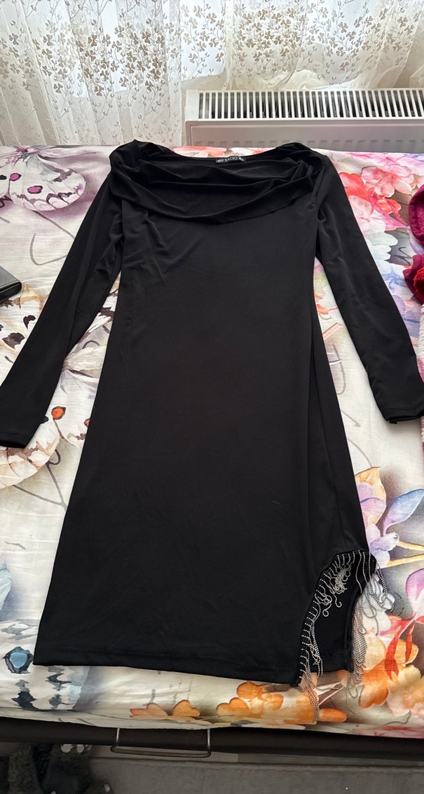 Siyah, uzun kollu, drapeli ve tek renkli bu uzun abiye elbise, gotik tarzıyla romantik akşamlar için uygundur. Asimetrik etek ucu ile avant-garde dokunuş sağlar. S beden ancak ben M bedenim oldu