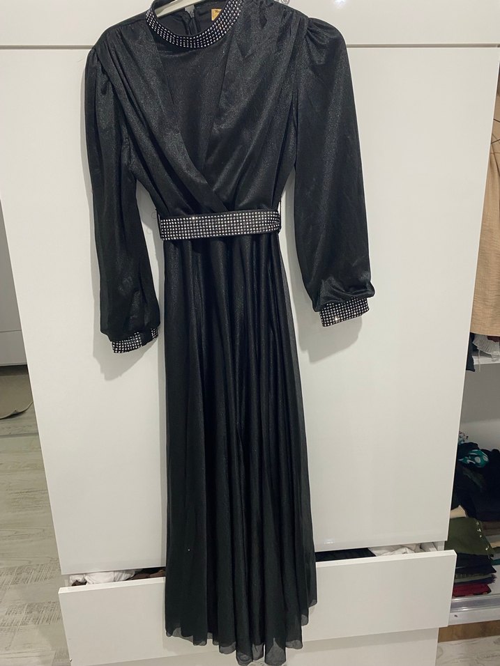 Yüksek yakalı, uzun kollu, bol kesim siyah uzun gece elbisesi. Drapeli detaylar ve yakada, kolda, belde taş süslemeleri bulunur. Hafif sim yansımalıdır