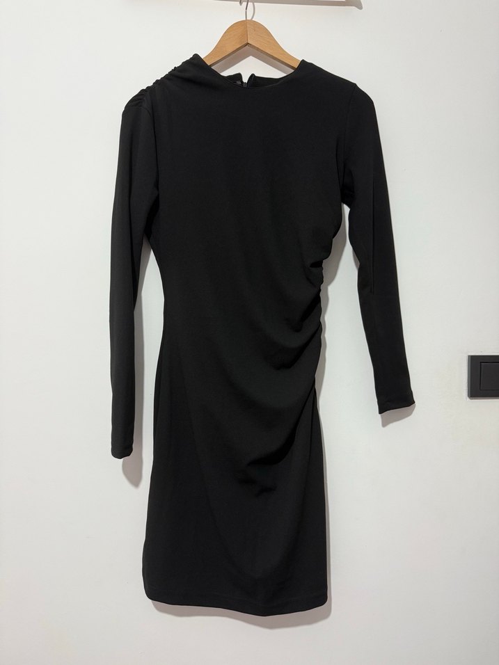 Siyah, uzun kollu, V yakalı ve drapeli detaylara sahip bu dar kesim elbise, romantik gece için gotik tarzda ideal.