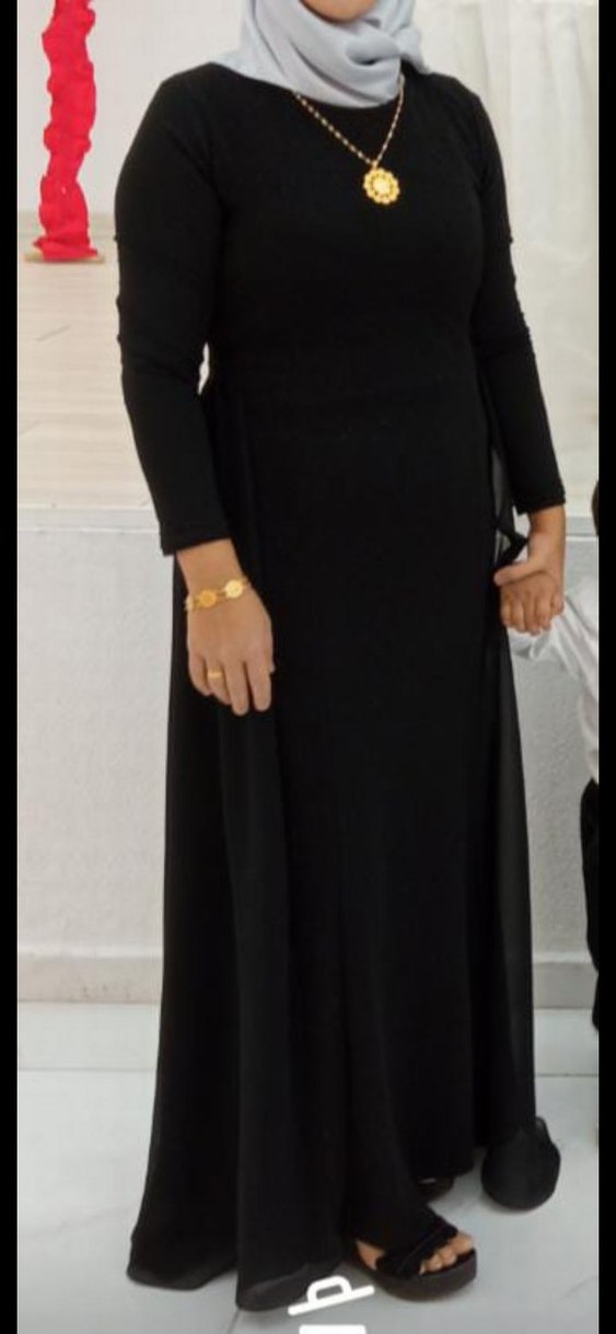 Siyah renkte abiye simli , uzun kollu ve yuvarlak yakalı bu uzun elbise, gevşek ve drapeli kesime sahiptir. Sentetik kumaştan üretilmiş, gotik ve modest tarzı yansıtır.