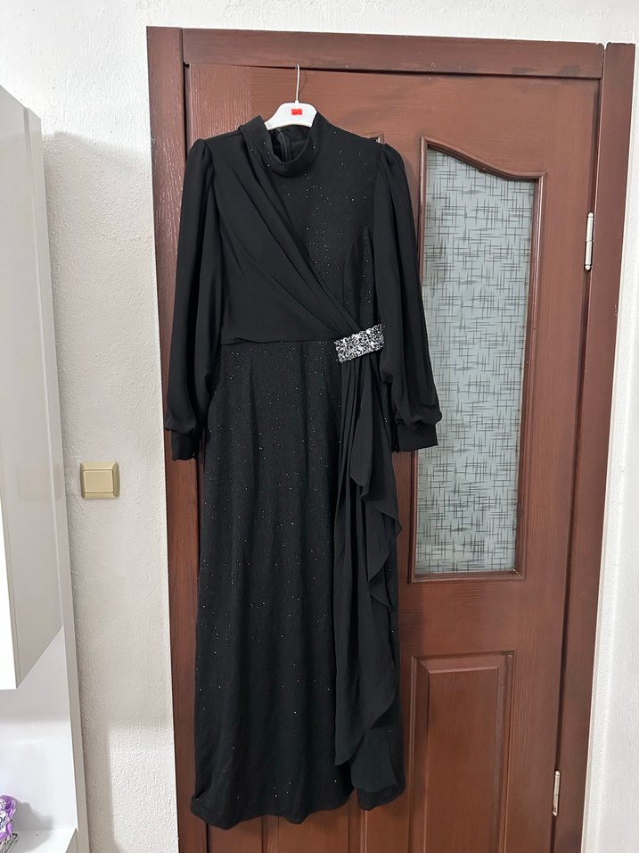 Siyah uzun kollu, yüksek yakalı gece elbisesi, drapeli tasarım ve süslü toka detayına sahip, klasik gotik tarzda regular fit.