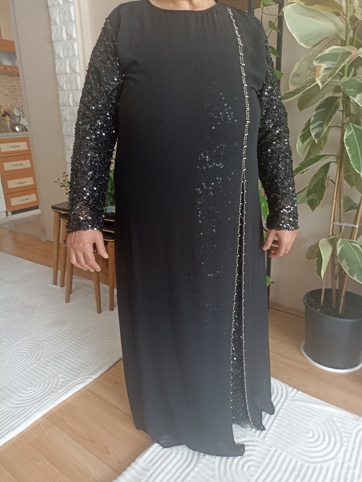 Uzun siyah elbise, payetli uzun kollu ve drapeli tasarımıyla partiler için uygun modest gotik stil sunar. Yuvarlak yaka ve regular fit şıklık katıyor.
