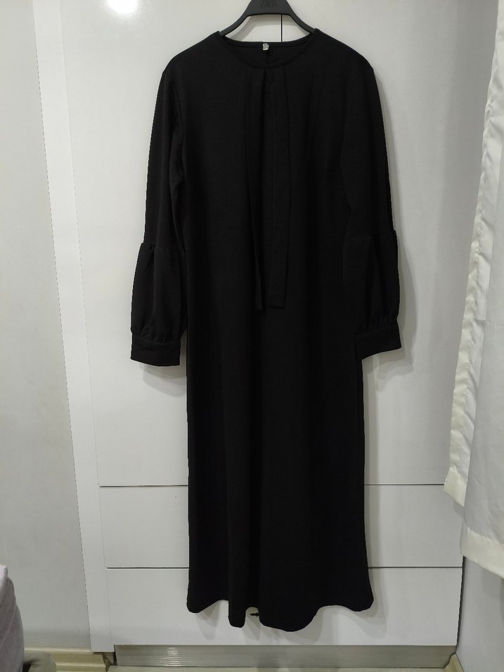 Siyah, uzun kollu, yuvarlak yakalı ve drapeli tasarıma sahip uzun elbise. Yumuşak sentetik kumaştan üretilmiş, ofis için uygun minimalist tarzda, rahat kesim.
