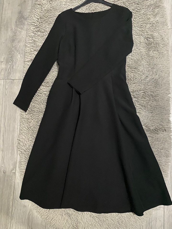 Siyah uzun kollu, tek parça drapeli elbise. Tek renk, tekne yaka ve rahat kesimiyle klasik ofis stiline uygun.