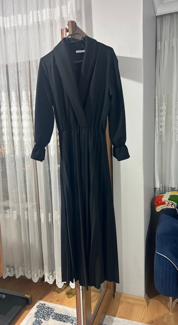 Siyah, uzun kollu, drapeli ve yakalı bu uzun elbise, ofis için uygun klasik gotik Paris tarzında, ipeksi dokulu ve regular fit.
