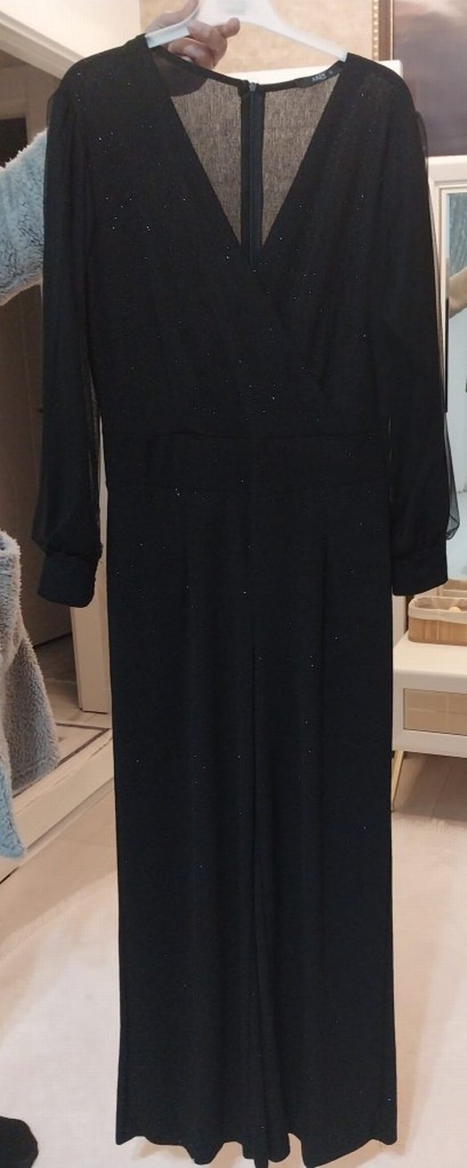 Siyah, uzun kollu, drapeli ve kırmalı yakalı, ipeksi kumaştan yapılmış, klasik kesimli bu tulum ofis kullanımı için uygundur.