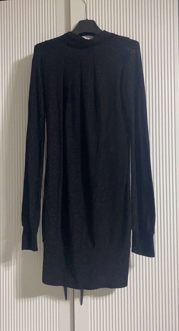Siyah, uzun kollu, yüksek yakalı ve drapeli detaylara sahip dar kesim triko elbise. Midi boy ve minimal stil, ofis için uygun. Yumuşak sentetik kumaştan üretilmiştir.