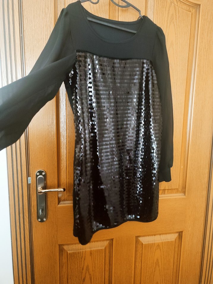 Siyah, uzun kollu, drapeli ve parlak payet detaylı fitted midi abiye elbise. Yuvarlak yakalı, uzeri tül diğer kısımlar payet çok kaliteli şık