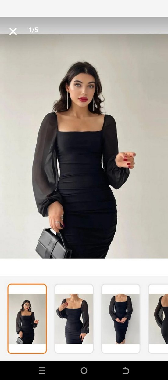 Drapeli uzun kollu, kare yakalı, siyah mini elbise. Pürüzsüz sentetik kumaştan, şık ve dikkat çekici.