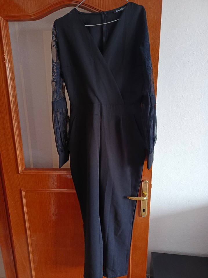Siyah uzun kollu, notched lapel yakalı ve drapeli detaylı tulum. kolları güpür