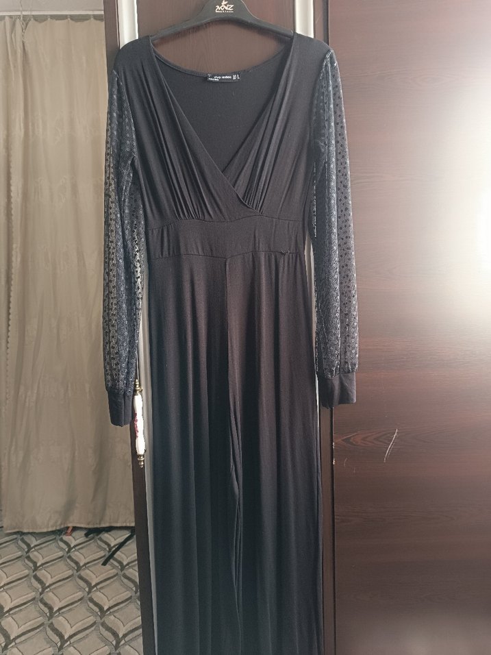 Siyah uzun tulum, V yaka ve drapeli detaylara sahip. Uzun, tül desenli kolları ve salaş kesimiyle ofis için uygun, sentetik kumaştan üretilmiştir.