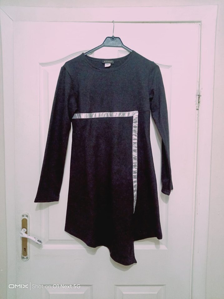 Siyah uzun kollu, drapeli ve gri detaylı tunik. Yuvarlak yaka, rahat kesim, yumuşak kumaş. Günlük kullanım için uygundur. 40 bedendir..38-40-42-44. bedenleri vardır