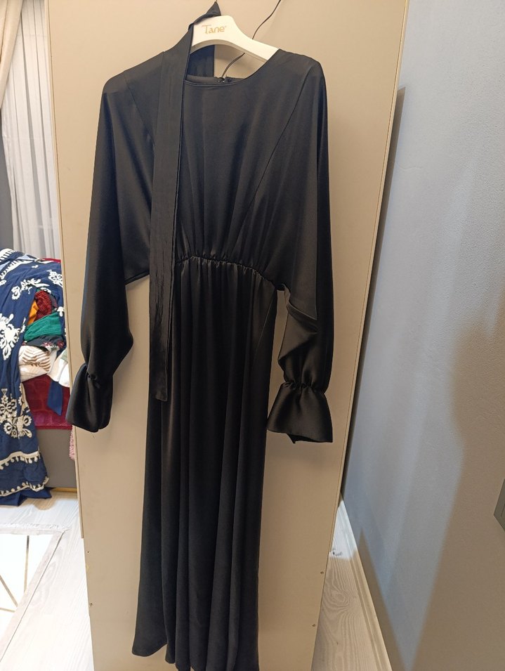 Siyah uzun kollu, yüksek yakalı ve drapeli kesime sahip uzun elbise. iki kez giydim bana olmadığı için satıyorum.