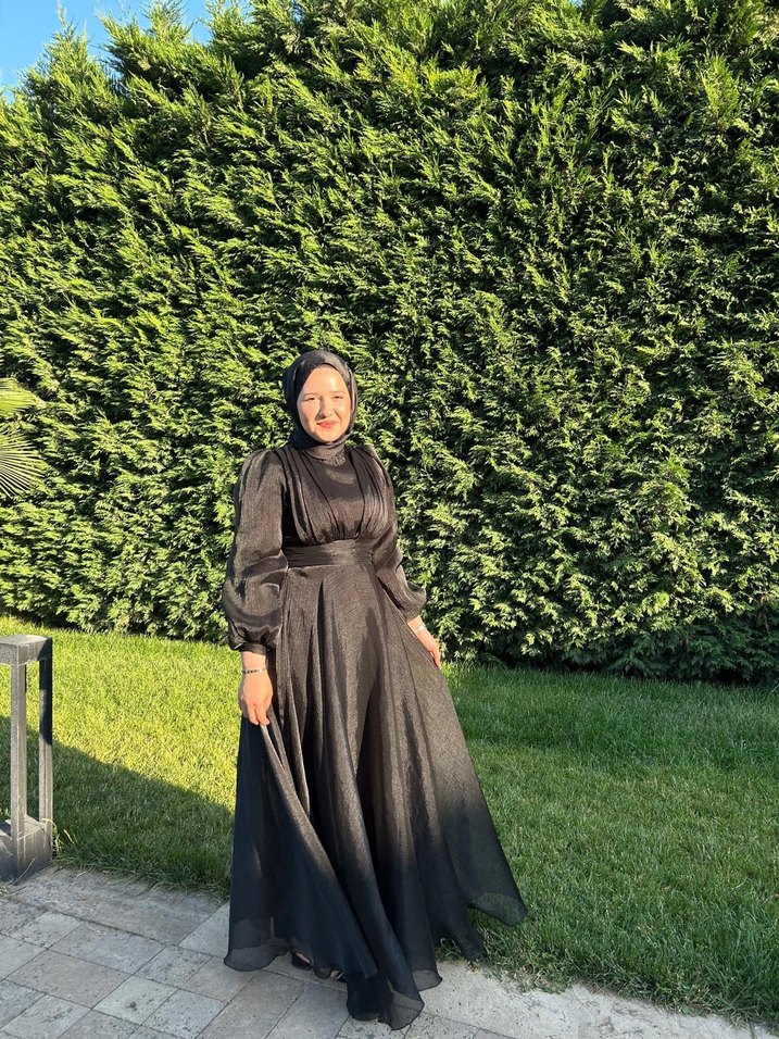 Siyah renkte, yüksek yakalı, uzun kollu ve drapeli tasarıma sahip abiye elbise. Modest ve gotik tarzda, düğünler için uygun. Abiye şal hediyedir
