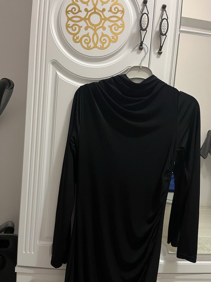 Siyah, uzun kollu ve drapeli yüksek yakalı bu uzun elbise, ipeksi kumaştan üretilmiştir. Gotik ve avant-garde tarzlara uygun, romantik akşamlar için ideal. Yalnızca bir kez giydim
