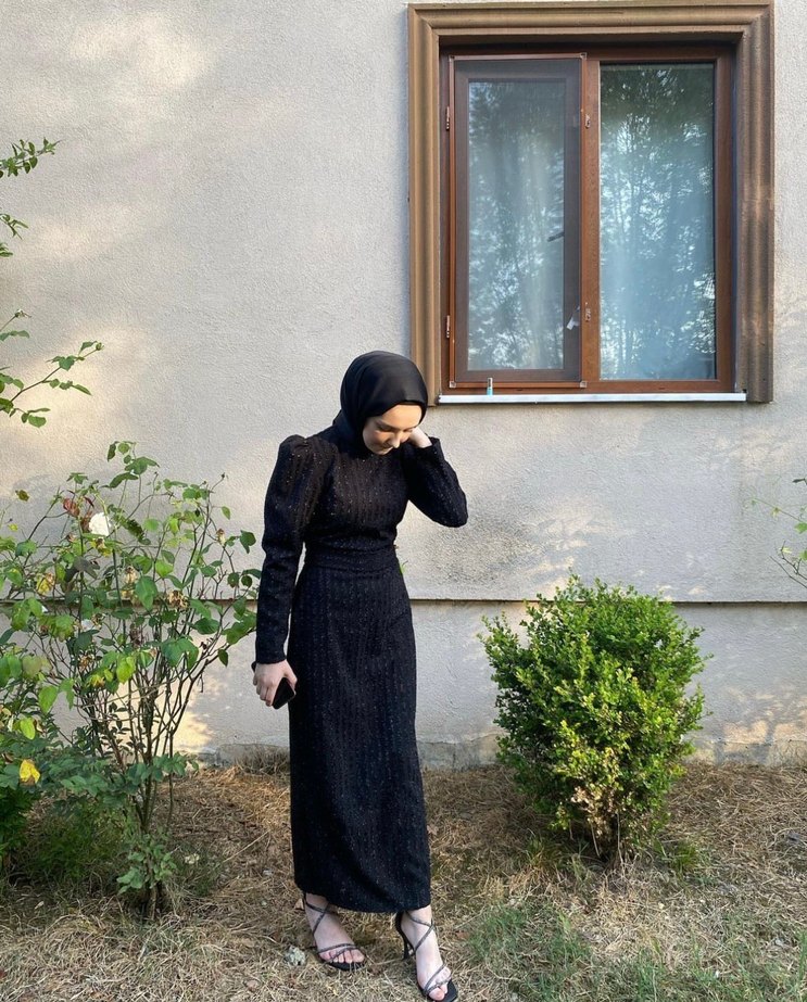 Siyah uzun elbise, yüksek yakalı ve uzun kollu, hicbir defosu yoktur, elbise boyu 135 cmdir.