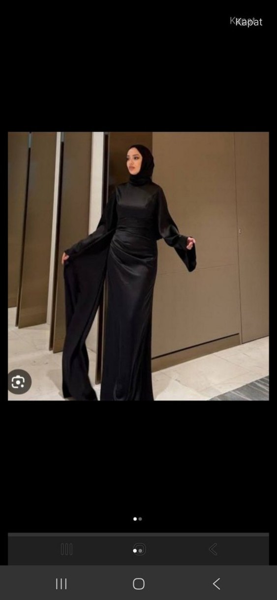Siyah uzun elbise, yüksek yaka ve uzun kollu drapeli tasarıma sahiptir. Modest, düzenli kesim ve gotik tarzıyla ofis için uygundur.