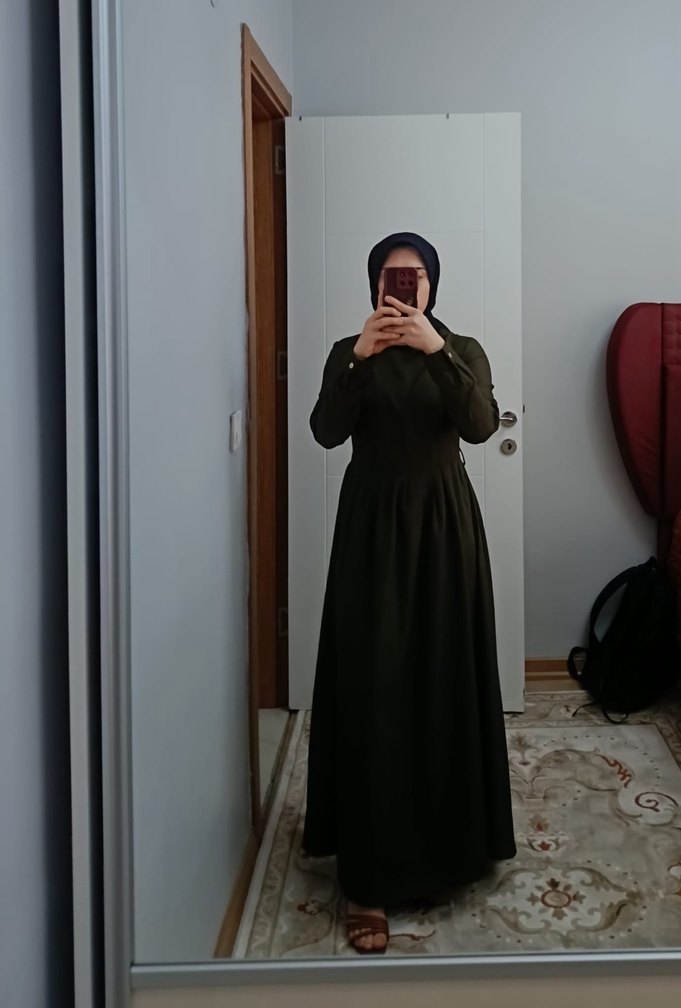 Siyah uzun kollu, yüksek yakalı, ince ve dökümlü kumaştan yapılmış, bol kesimli uzun elbise, günlük kullanıma uygundur.
