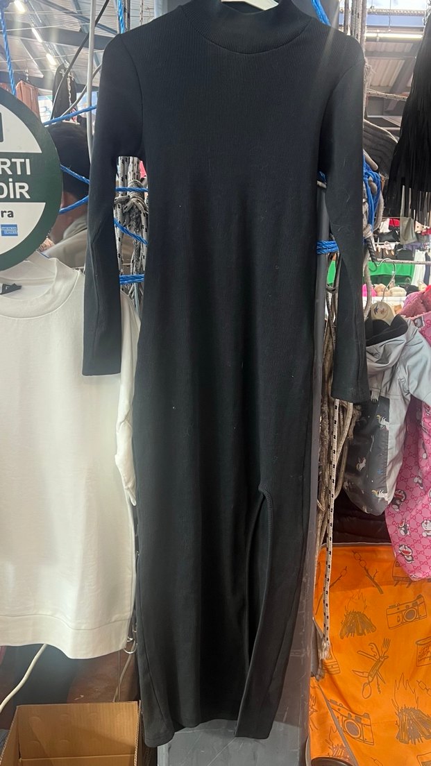 Bu siyah, uzun kollu, yüksek yaka ve drapeli detaylara sahip dar kesim elbise, düz ve şık bir görünüme sahiptir. Pürüzsüz sentetik kumaştan üretilmiştir ve günlük kullanıma uygundur. RTI etiketi bulunur.