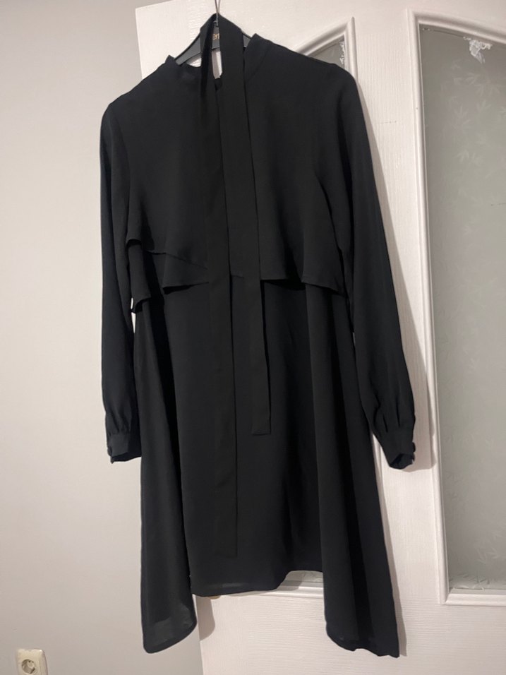 Yüksek yakalı, bol kesim ve drapeli detaylara sahip siyah uzun kollu tunik, yumuşak sentetik kumastan. Kendi kumasindan kemeri de mevcut