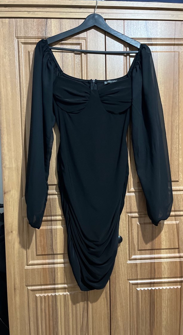 Siyah renkte, uzun kollu ve V yaka olan bu dar kesim elbise, drapeli detaylarıyla gotik ve iddialı bir tarz sunar.