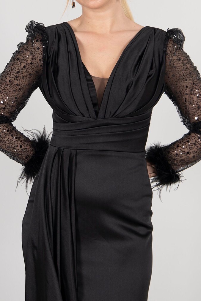 Siyah uzun kollu abiye elbise, derin V yaka ve drapeli detaylara sahiptir. Transparan, desenli kolları tüy detaylarıyla tamamlanmıştır. Partiler için uygundur.