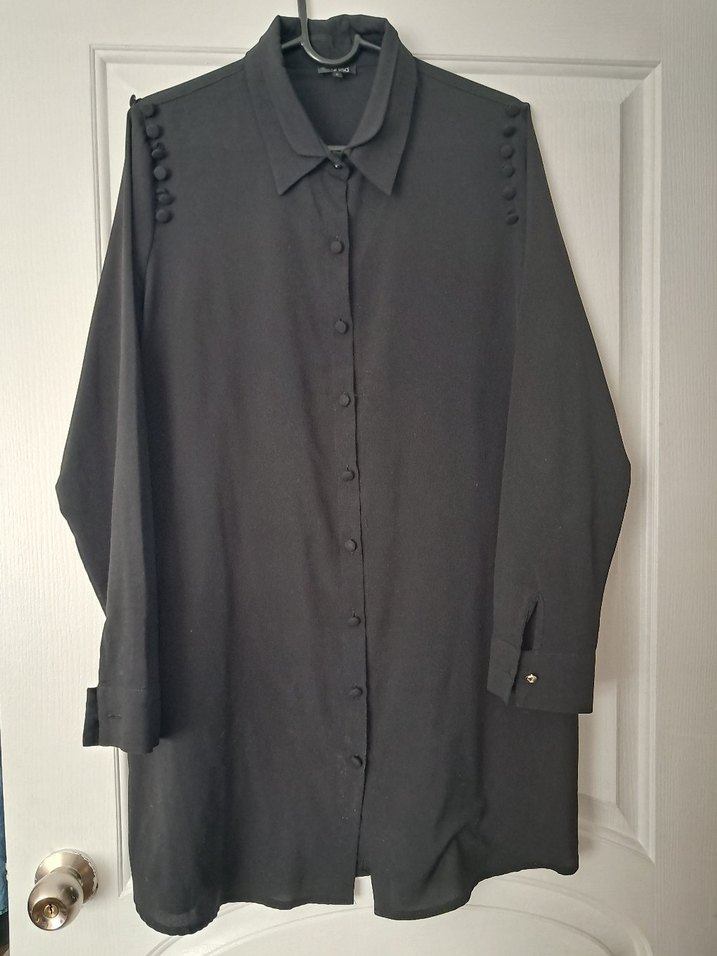 Uzun kollu, düğmeli ve omuzlarında düğme detaylı siyah gömlek. İpek gibi dokulu, yakası kesik yaka, ofis kullanımı için uygun.