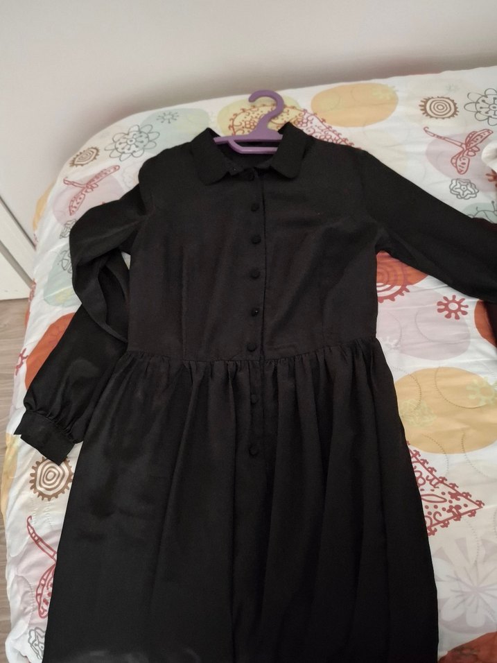 Siyah, uzun kollu, yakalı ve düğmeli ön kısmı olan elbise. Rahat kesimi ve yumuşak sentetik kumaşıyla trend gotik stil için uygundur. Markası belli değil. Kumaşı yumuşak satenimsi bi kumaş. Etek kısmında iç astarı mevcut