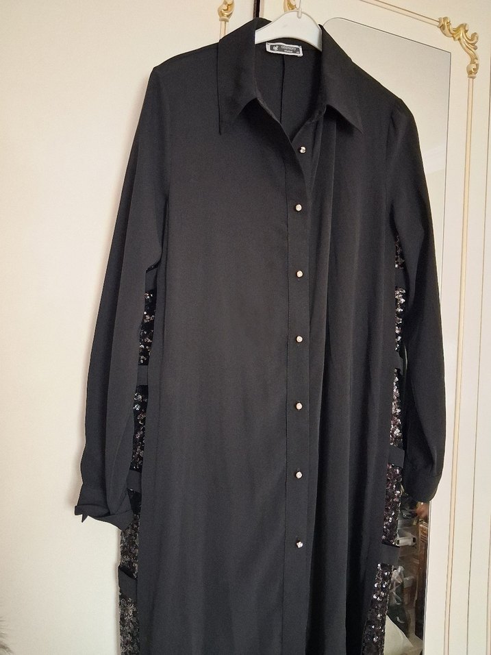 Siyah, uzun kollu, düğmeli ve yakalı bu tunik, sentetik kumaştan üretilmiş ve gevşek kesimlidir. Gotik tarzda, trend bir günlük görünüm sunar.