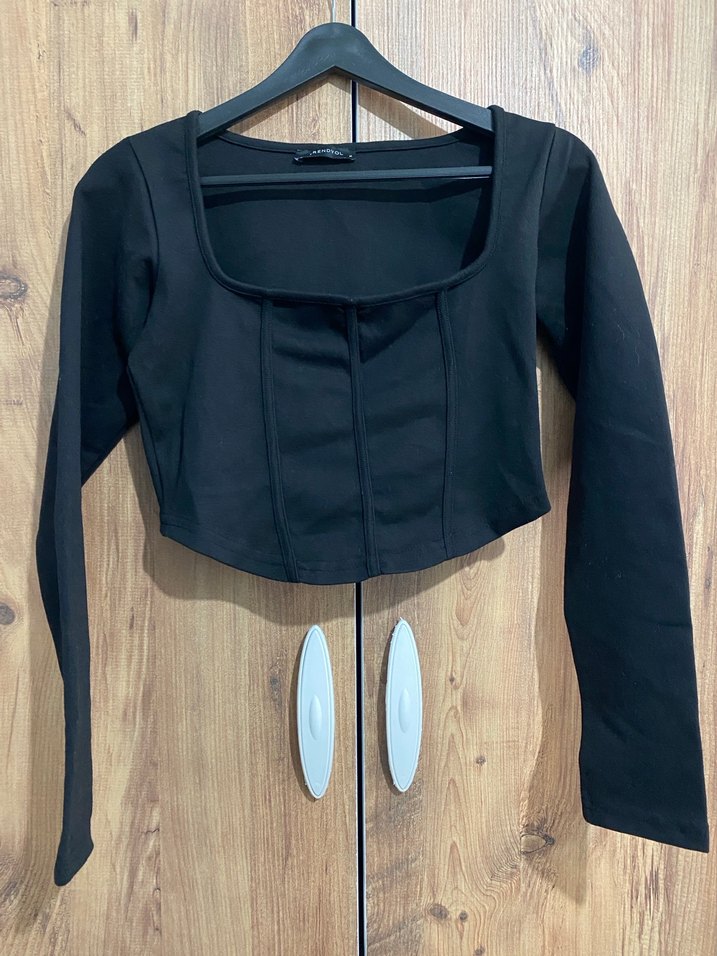 Siyah, uzun kollu, kare yaka ve düğmeli dar kesim bluz. Pürüzsüz sentetik kumaştan, gündelik sokak stili için uygun. M beden ürün az kullanıldı hiçbir sorun yoktur.