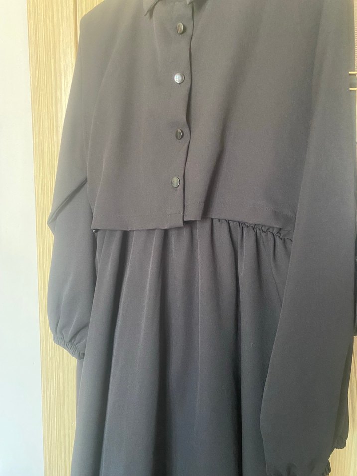 Siyah renkli, yakalı ve düğmeli uzun kol elbise, bol kesim ve sentetik yumuşak kumaştan iki defa tek giyindim yenidir