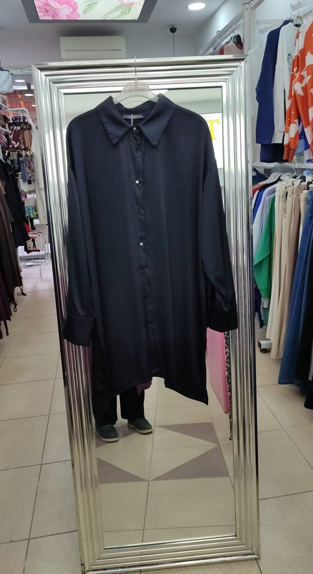 Siyah renk, uzun kollu, düğmeli, bol kesim kadın gömlek. Sentetik kumaştan, salaş ve günlük kullanıma uygun. saten kumaş şık bir kullanım sağlar 44 beden ürünlerimiz mağaza ürünüdür